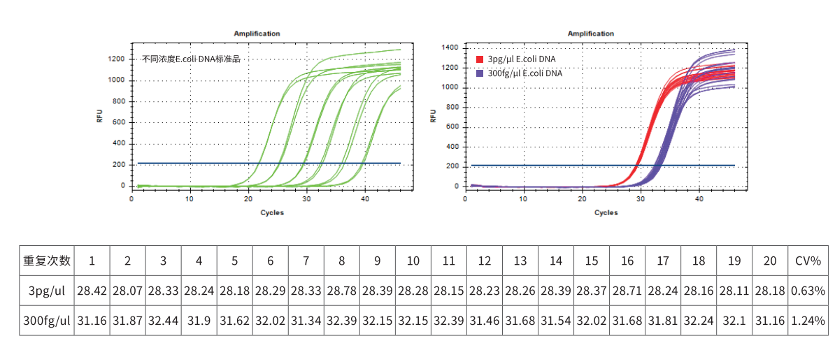 重復 20 次檢測 3 pg/μl 和 300 fg/μl 的 E.coli DNA,CT 值 CV<5%,結果顯示 GenStar #A801 重復性好。