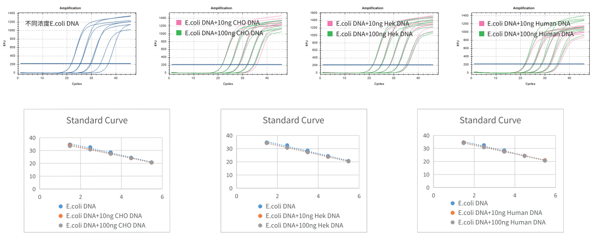 在濃度為 300 pg/μl、30 pg/μl、3 pg/μl、300 fg/μl、30 fg/μl 的 E.coli DNA 中分別加入 10 ng/100 ng CHO、Hek 和 Human DNA 作為干擾 DNA,結果顯示干擾組與對照組基本重合,可見 GenStar #A801 特異性很強,不同細胞系間無交叉反應,結果更準確。