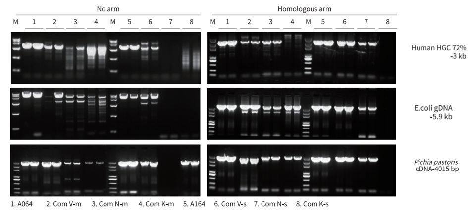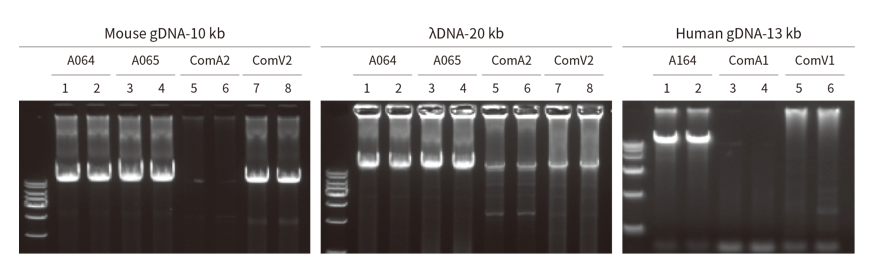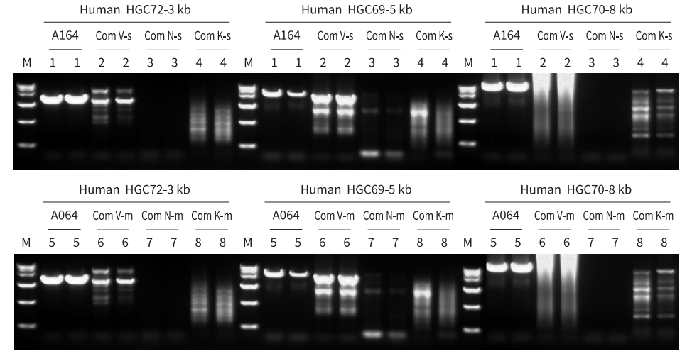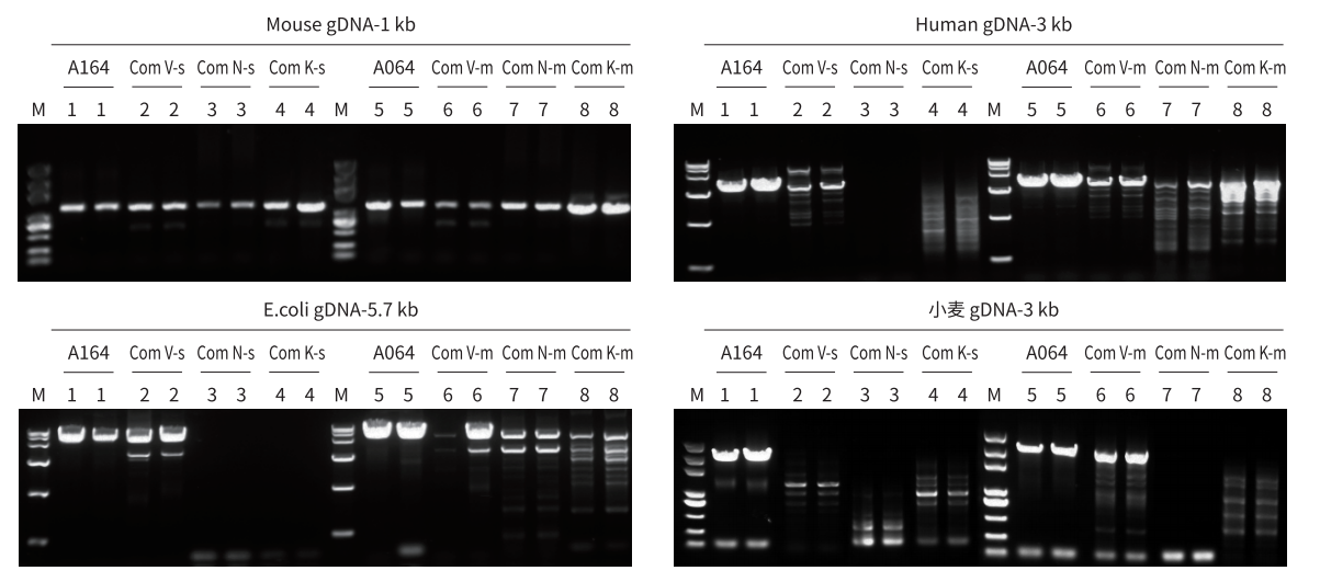 分別以人、小鼠、小麥、E.coli gDNA 為模板,使用 A064/A164、Com V、Com N、Com K 進(jìn)行不同長度片段擴(kuò)增。結(jié)果顯示,A064/A164 對不同種屬來源不同長度的 gDNA 片段兼容性強(qiáng),均能良好擴(kuò)增,且優(yōu)于 Com V、Com N 和 Com K
