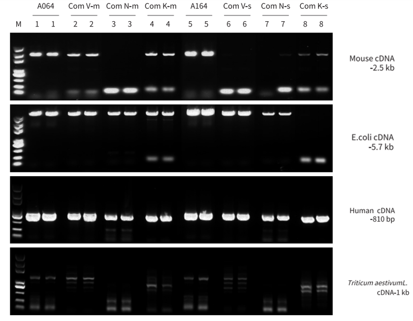 分別以人、小鼠、E.coli cDNA 為模板,使用 A064/A164、Com V、Com N、Com K 進(jìn)行不同長度片段擴(kuò)增。結(jié)果顯示,A064/A164 對不同種屬來源不同長度的 cDNA 片段兼容性強(qiáng),均能良好擴(kuò)增