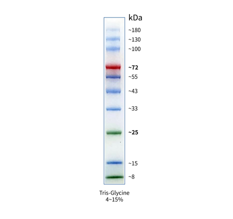 本產(chǎn)品包含了 8-180 kDa 的 10 種高度純化預(yù)染的重組蛋白質(zhì)。10 種條帶分別為:8、15、25、33、43、55、72、100、130、180 kDa。其 8 kDa 和 25 kDa 條帶為綠色預(yù)染條帶,72 kDa 條帶為橙紅色預(yù)染條帶,方便判斷各個(gè)條帶準(zhǔn)確位置。 本產(chǎn)品包裝便利,為即用型產(chǎn)品,請(qǐng)勿加熱、稀釋或添加還原劑。使用本產(chǎn)品可動(dòng)態(tài)觀察蛋白電泳狀態(tài)和轉(zhuǎn)膜效果。經(jīng) SDS-PAGE 電泳后轉(zhuǎn)移到 PVDF 膜、NC 膜上可見清晰的彩色條帶。預(yù)染蛋白與染料結(jié)合后,在不同緩沖體系中,位置會(huì)有遷移,本產(chǎn)品在用于判斷目的蛋白分子量大小時(shí)僅供參考。