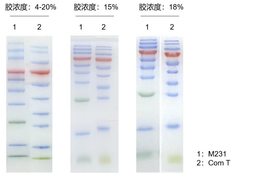 分別使用GenStar #M231、Com T 在不同濃度凝膠中進(jìn)行電泳測(cè)試,上樣量 5 μl、電壓 200V、電泳 45 min。結(jié)果顯示,GenStar #M231 電泳條帶清晰,電泳遷移率和小條帶清晰度與 Com T 有差異,效果與 Com T 相當(dāng)。