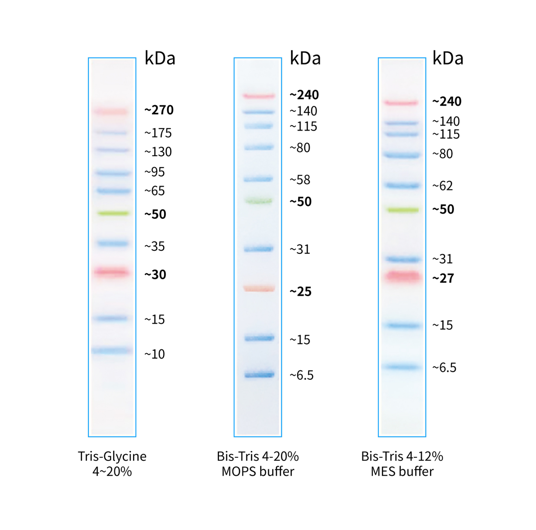 本產(chǎn)品由跨度從 10-270 kDa 的 10 種高度純化預(yù)染的重組蛋白質(zhì)組成,各條帶濃度約為 0.1-0.5 mg/ml。其中 30 kDa 和 270 kDa 條帶為加強(qiáng)條帶,方便判斷各個(gè)條帶的準(zhǔn)確位置。本產(chǎn)品適合作為 SDS-PAGE 電泳時(shí),變性蛋白樣品的分子量參照,并可實(shí)時(shí)觀察蛋白樣品的電泳分離狀況,也可用于檢測(cè) Western blot 的轉(zhuǎn)膜效率。由于共價(jià)結(jié)合的染料會(huì)影響蛋白質(zhì)分子的電泳遷移率,本產(chǎn)品僅適于粗略地估計(jì)目的蛋白樣品的分子量。