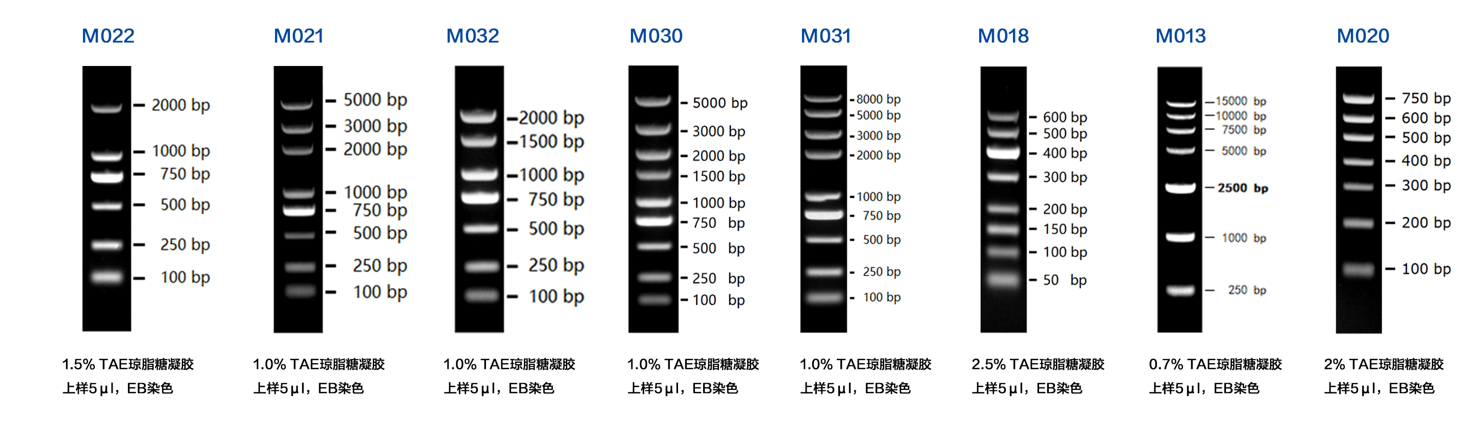 本產(chǎn)品為預(yù)混有上樣緩沖液的即用型 DNA 分子量標(biāo)準(zhǔn),由 9 條線狀雙鏈 DNA 條帶組成,適用于對 100-5000 bp 的雙鏈 DNA 分子大小的估算和粗略定量。本產(chǎn)品的 9 條帶分別為 100、250、500、750、1000、1500、2000、3000 和 5000 bp。其中 750 bp 條帶濃度最大,為 100 ng/5 µl,其余條帶濃度約為 50 ng/5 µl。