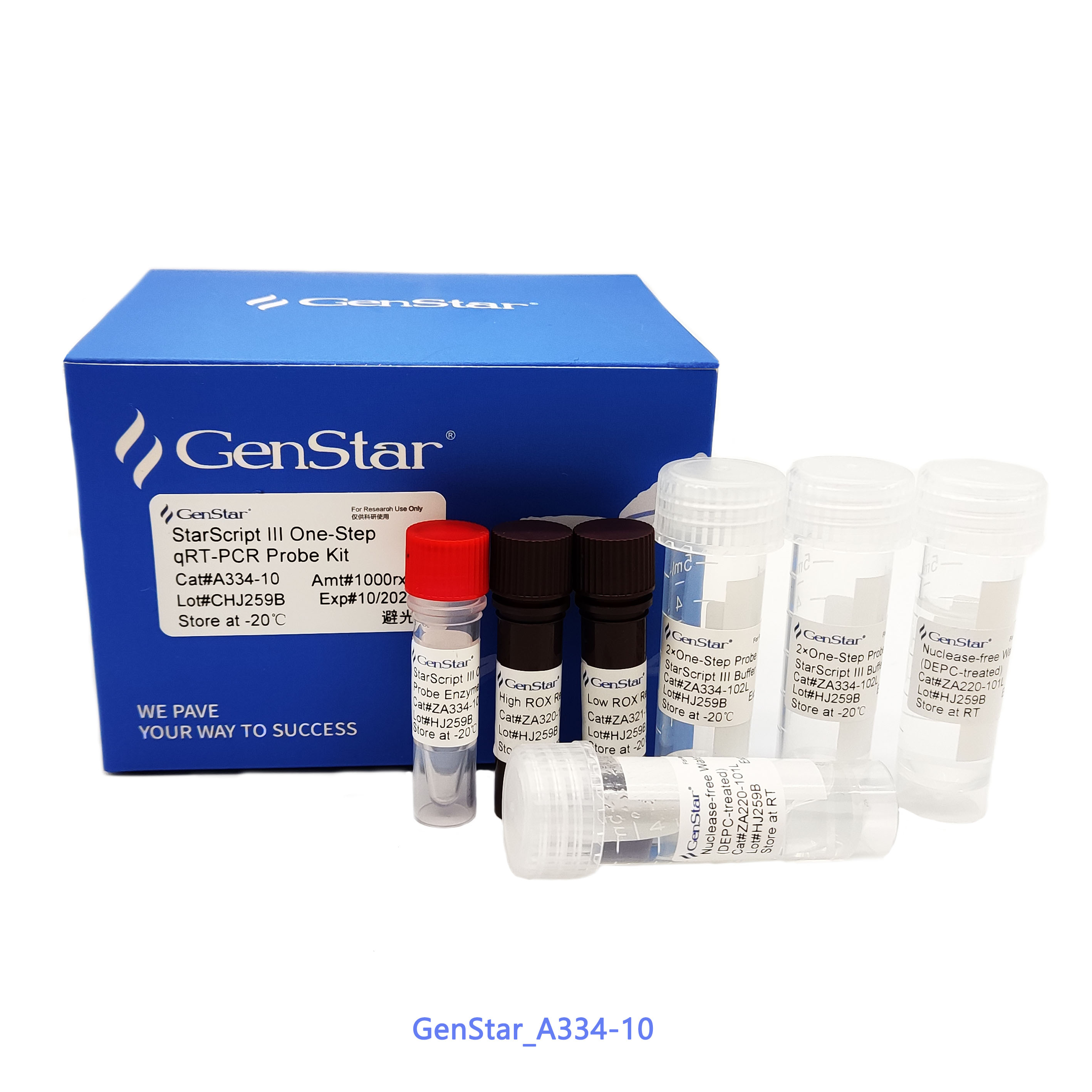 StarScript III One-Step qRT-PCR Probe Kit 是采用探針法進(jìn)行一步法反轉(zhuǎn)錄實(shí)時(shí)熒光定量檢測(cè)的專用試劑盒。使用本制品進(jìn)行 Real Time RT-PCR 反應(yīng)時(shí),以提取的 RNA 為模板,在同一反應(yīng)管內(nèi)連續(xù)進(jìn)行反轉(zhuǎn)錄和熒光定量檢測(cè),操作簡(jiǎn)單,并能有效防止污染、降低加樣誤差?;?StarScript III 反轉(zhuǎn)錄酶、抗體型 HotStart Taq DNA 聚合酶、配合優(yōu)化的 Buffer 體系,對(duì)于二級(jí)結(jié)構(gòu)復(fù)雜和 GC 含量高的 RNA 模板擴(kuò)增效果好,非常適合于 RNA 病毒等微量目標(biāo)基因的檢測(cè)。