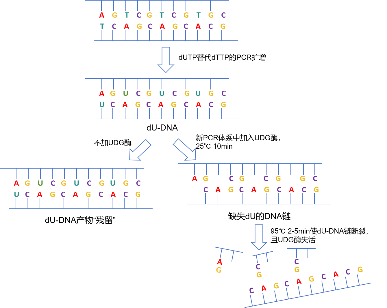 利用 UDG 酶選擇性水解含 dU 的 DNA 單鏈或 DNA 雙鏈的機制,巧妙地引入 dUTP 取代 PCR 體系中的 dTTP 而構(gòu)成了 dUTP/UDG 酶防污染系統(tǒng)。