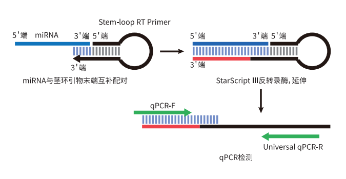 本試劑盒基于 StarScript III 反轉(zhuǎn)錄酶開發(fā)的,采用莖環(huán)結(jié)構(gòu)的逆轉(zhuǎn)錄引物與 miRNA 分子 3’ 端結(jié)合,在 StarScript III 反轉(zhuǎn)錄酶的作用下,獲得人為加長的 miRNA 第一鏈 cDNA。
