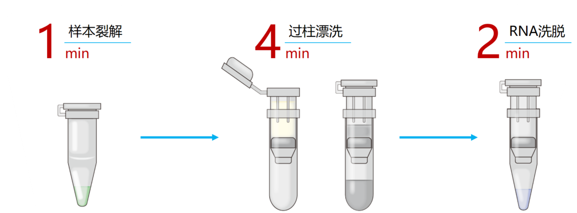 操作步驟簡單快速,可在 7 min 內(nèi)完成單個樣品 RNA 的提取,無需使用苯酚和氯仿等有機(jī)溶液,操作安全性更高。