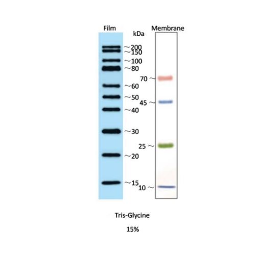 本產(chǎn)品由跨度從 10-200 kDa 的 14 種純化的天然蛋白混合而成。其中 25 kDa 條帶為綠色預(yù)染條帶、10 kDa 和 45 kDa 條帶為藍色預(yù)染條帶、70 kDa 條帶為粉色預(yù)染條帶,便于動態(tài)觀察電泳狀態(tài),方便判斷各個條帶的準(zhǔn)確位置和轉(zhuǎn)膜效果。其他 10 條條帶含有多種 IgG 亞型結(jié)合位點,可以和目的蛋白條帶同時結(jié)合抗體,用相同抗體來檢測,經(jīng)化學(xué)發(fā)光檢測或者通過 CCD 成像后顯示 15 kDa、20 kDa、30 kDa、40 kDa、50 kDa、60 kDa、80 kDa、100 kDa、150 kDa、200 kDa 條帶。