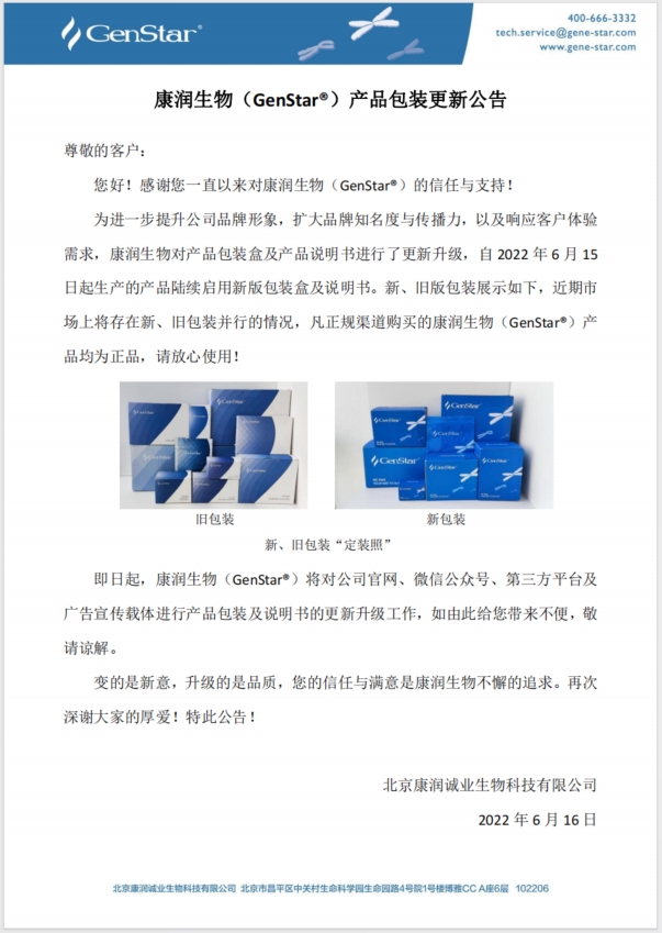 【包裝更換】康潤生物(GenStar)產(chǎn)品包裝更新公告